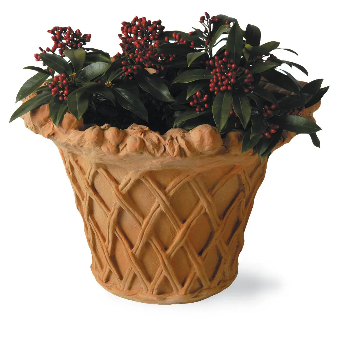 The Apple Basket was designed in house to create an attractive planter with extra decoration around the classic lattice shape. The fluted shape gives a versatile and generous planting area and the fruit decorating the top also compliments our range of Cirtus planters.
