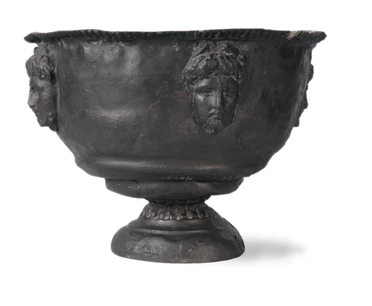 This unusual slightly lopsided little tabletop urn is cast from an antique original believed to be Jacobean complete with authentic dents and fatigue marks. There are four devil masks with horns decorating the urn.