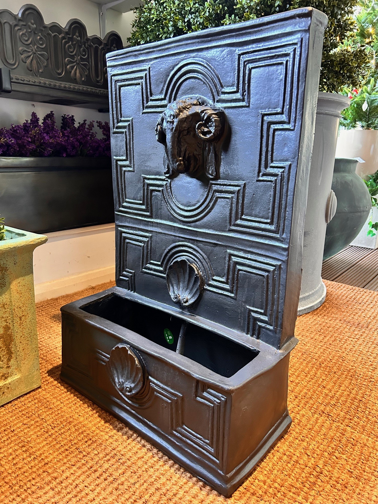 The easiest way to add the sound of running water to your garden or conservatory is by hanging one of our small wall fountains.The Rams Head fountain is designed to coordinate with our Elizabethan planters characterized by the symetrical design. The subtle sound of water makes this fountain a perfect choice for interior use, or outside on a patio. Lightweight it can be hung on a wall, fence or trellis. To install you simply need a hook and an electric power point; no plumbing is required. Pumps can also be purchased from us and are supplied on a 10m long cable.